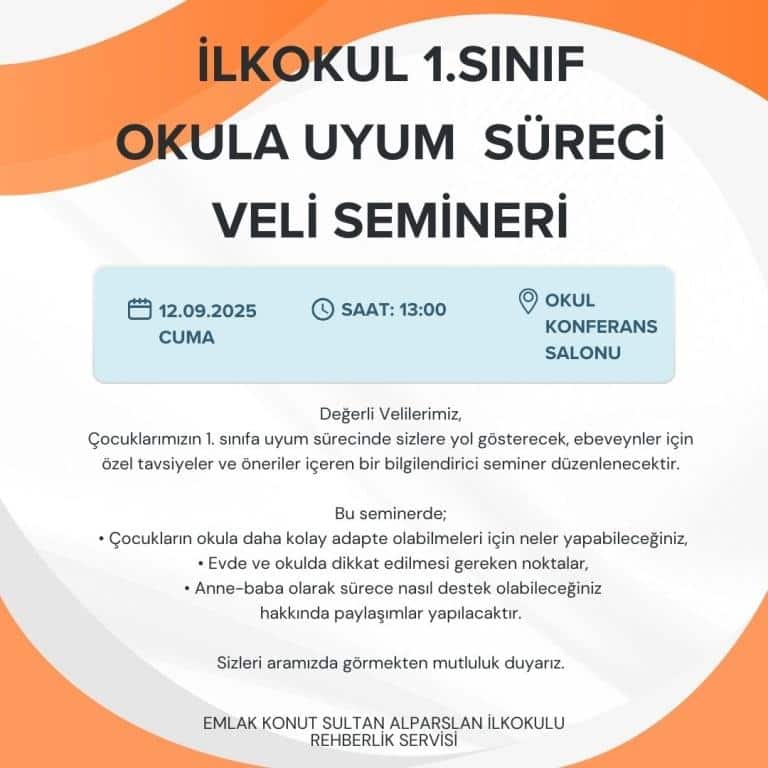 Çocuklarımızın okula uyum sürecini desteklemek amacıyla siz 1. sınıf velilerimize yönelik bilgilendirici bir sunum düzenlenecektir.
